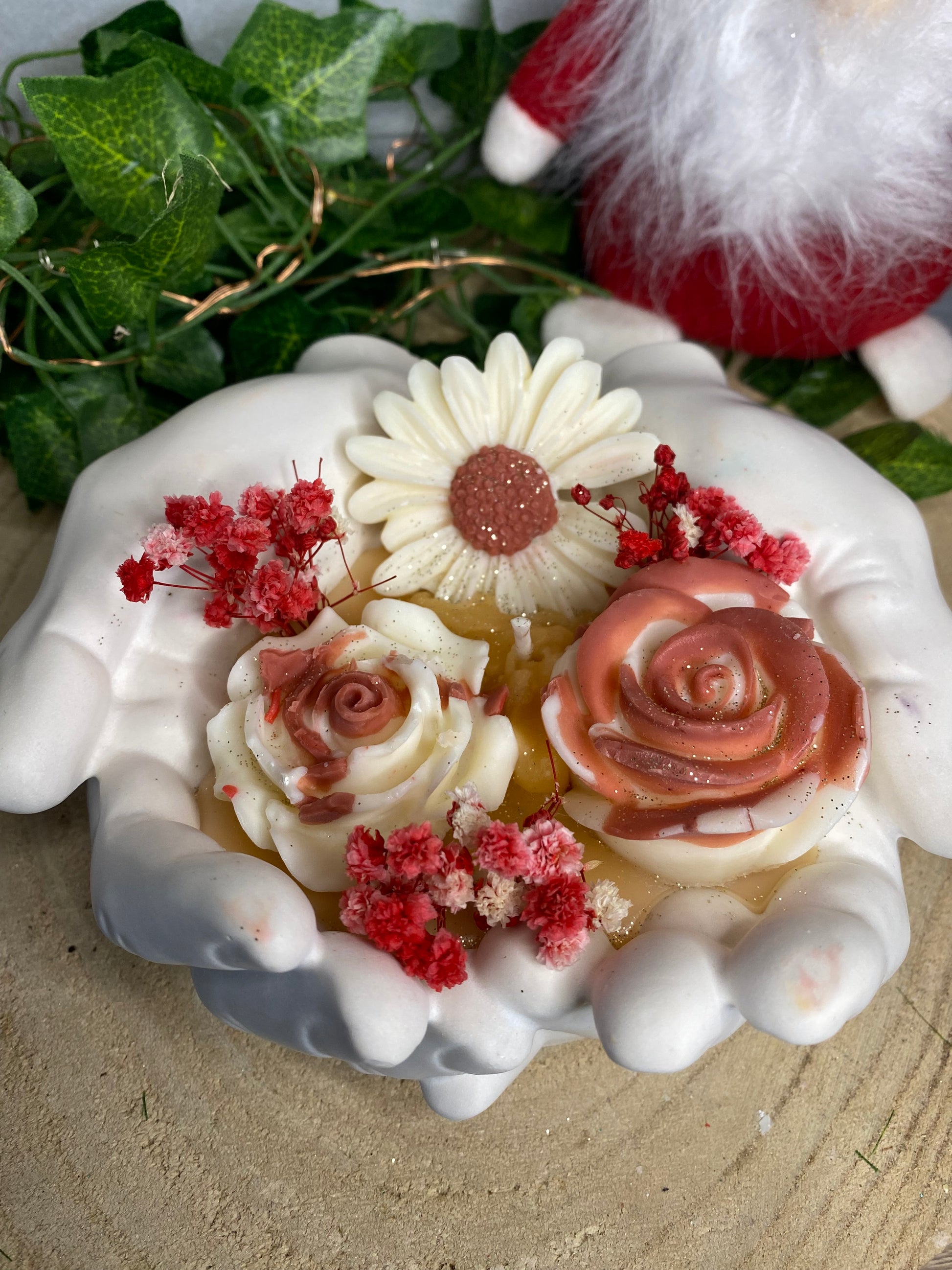 À l’intérieur, un bouquet de fleurs en cire reposant sur un fond de bougie parfumée 💐